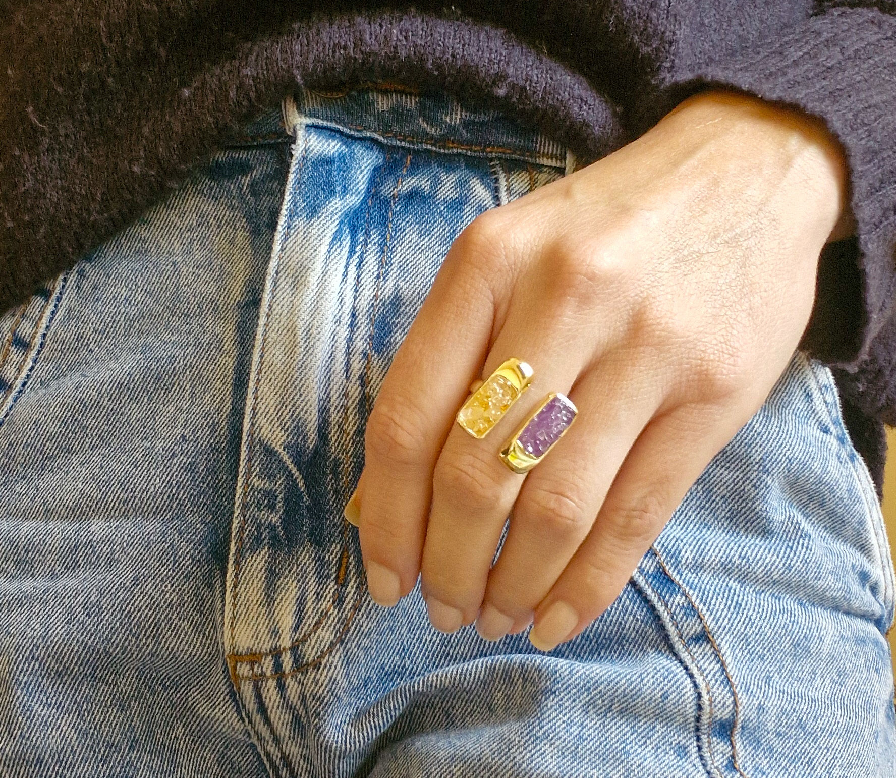 Uma joia que une duas forças poderosas da natureza em um único design. O anel duplo com ametista e citrino é ideal para mulheres que buscam equilíbrio emocional, proteção energética e expansão pessoal no dia a dia.