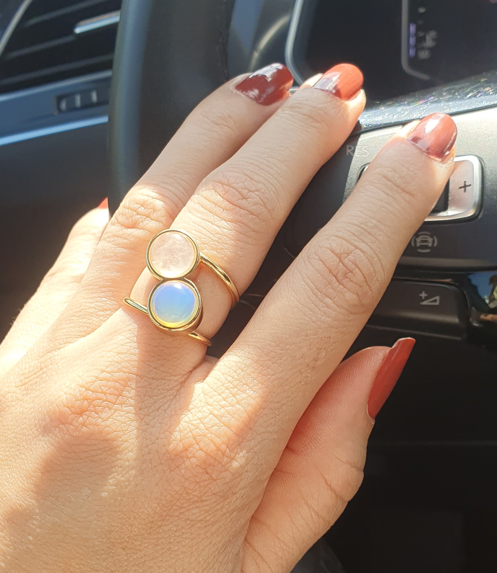Esse anel combina duas energias poderosas: a suavidade do quartzo rosa, que fortalece a autoestima e atrai amor, com o misticismo da opalina, conhecida por ampliar a intuição, acalmar emoções e aumentar a conexão interior.