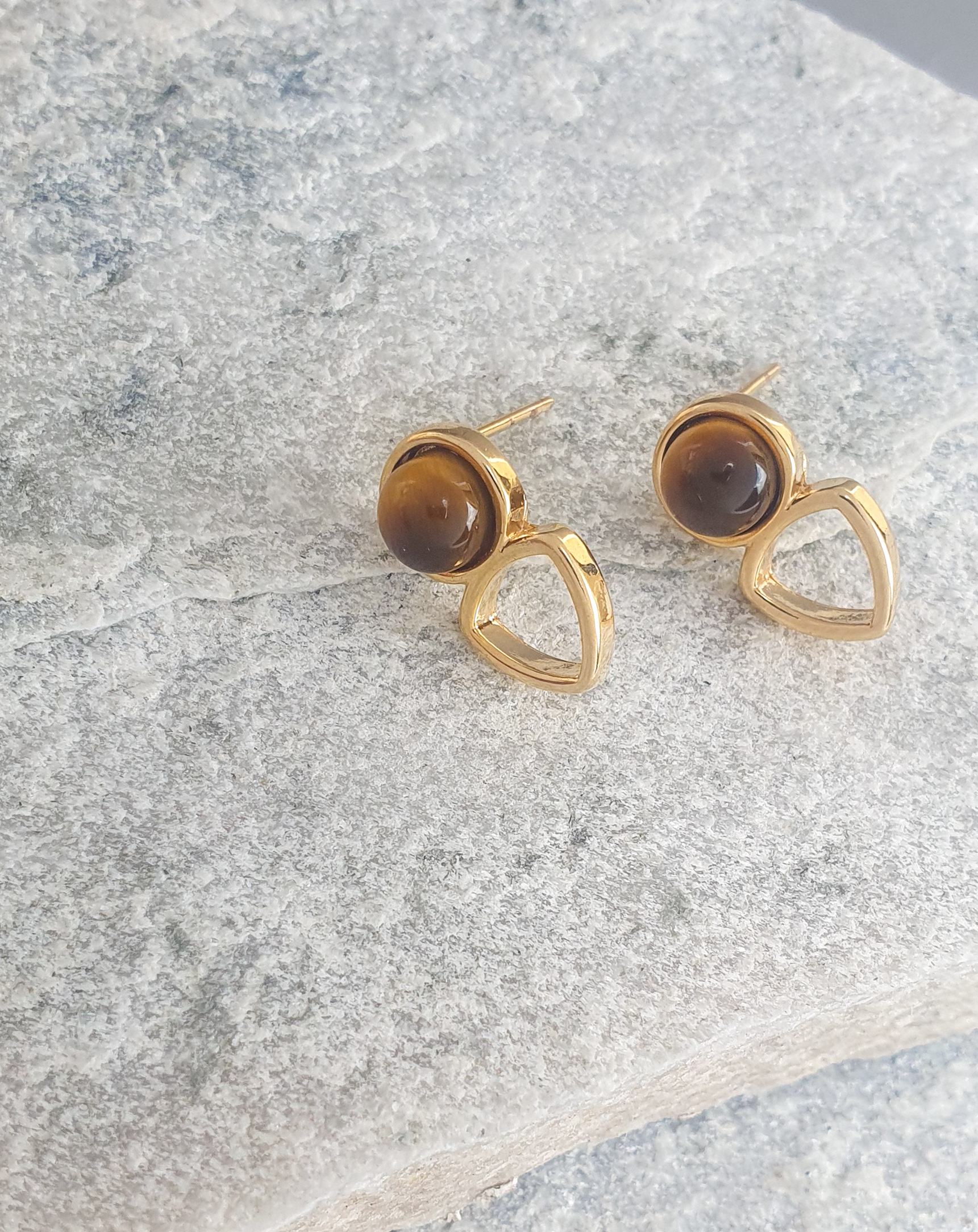 O design triangular do aro, feito com metal banhado a ouro, garante um visual moderno e versátil, enquanto a pedra olho de tigre, com suas listras marrom-douradas e brilho natural, adiciona um toque de originalidade e significado à peça.