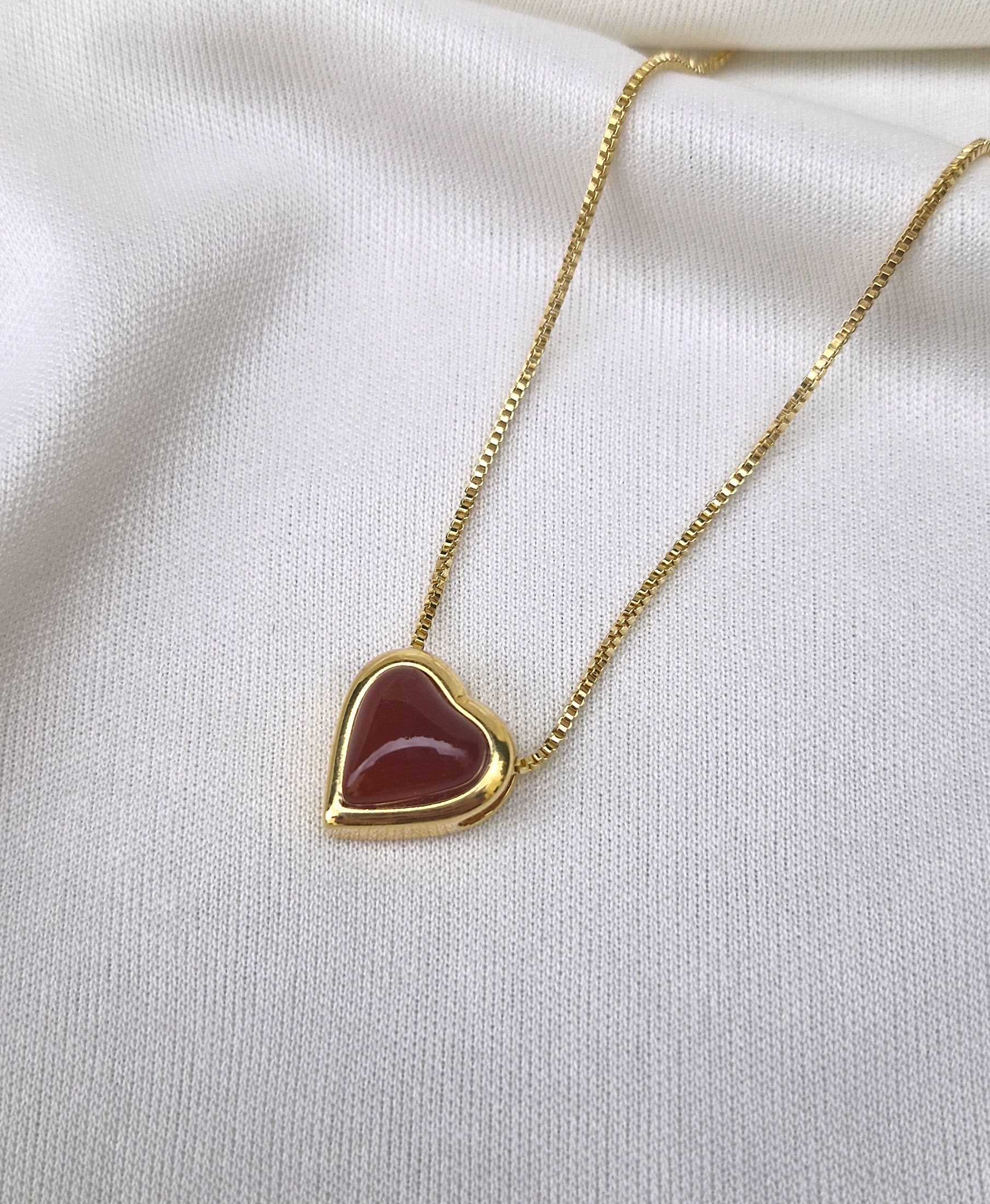 • Pingente em formato de coração com ágata vermelha natural, lapidação delicada e brilho vibrante.